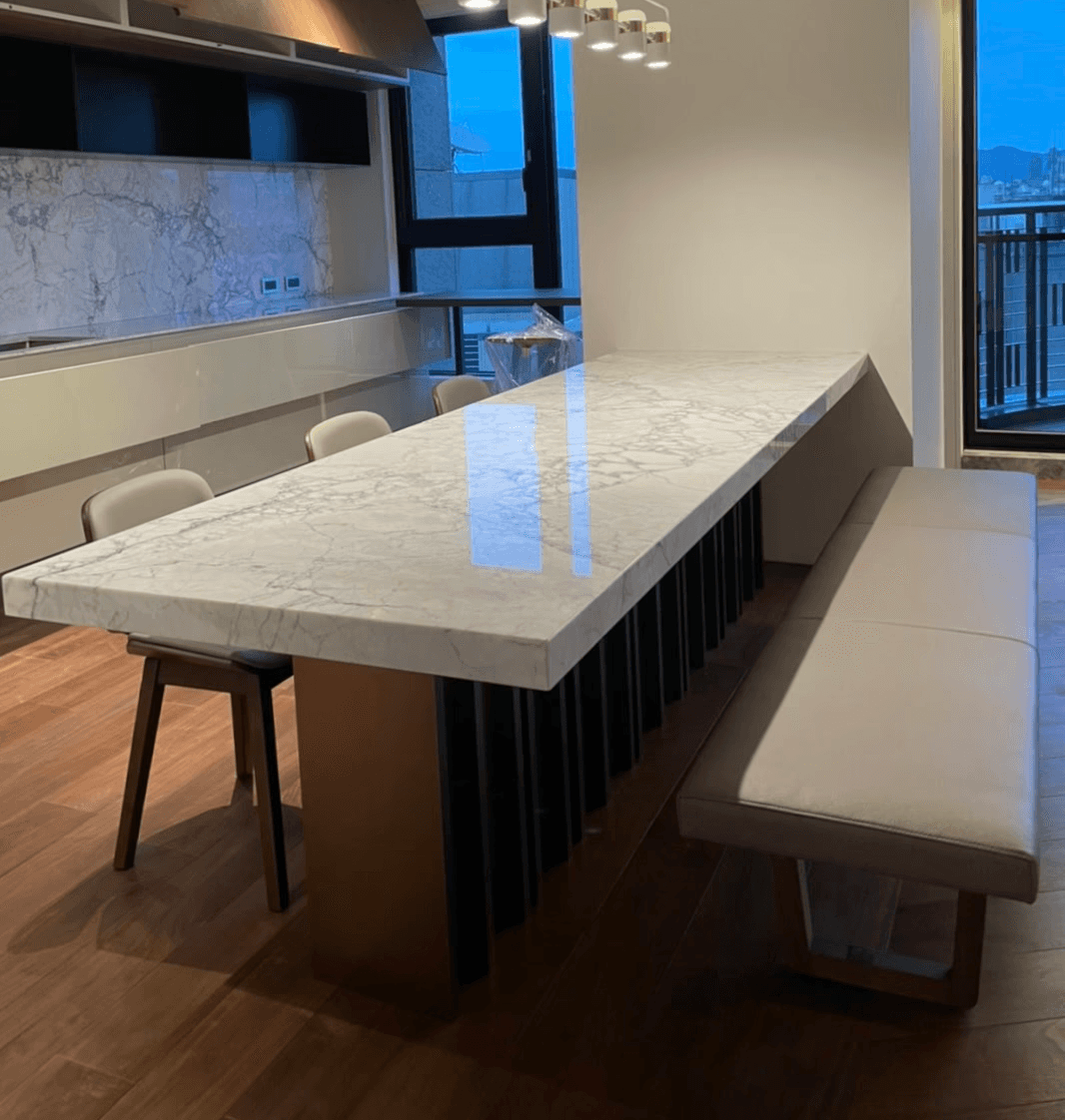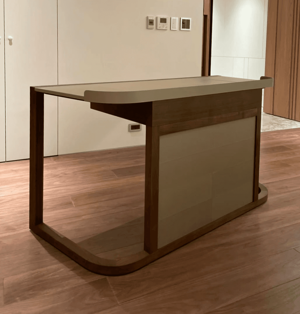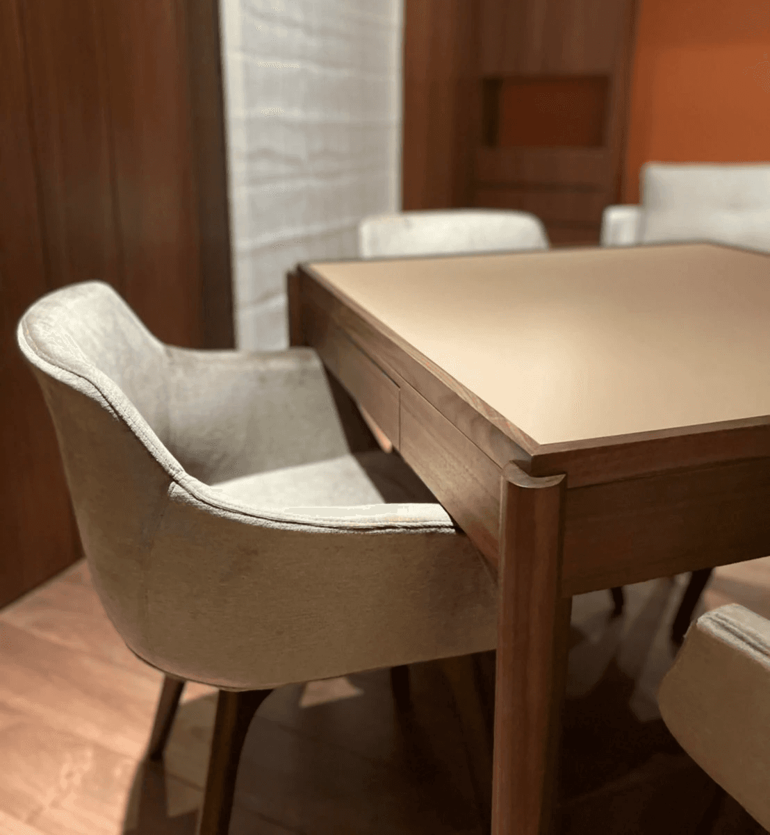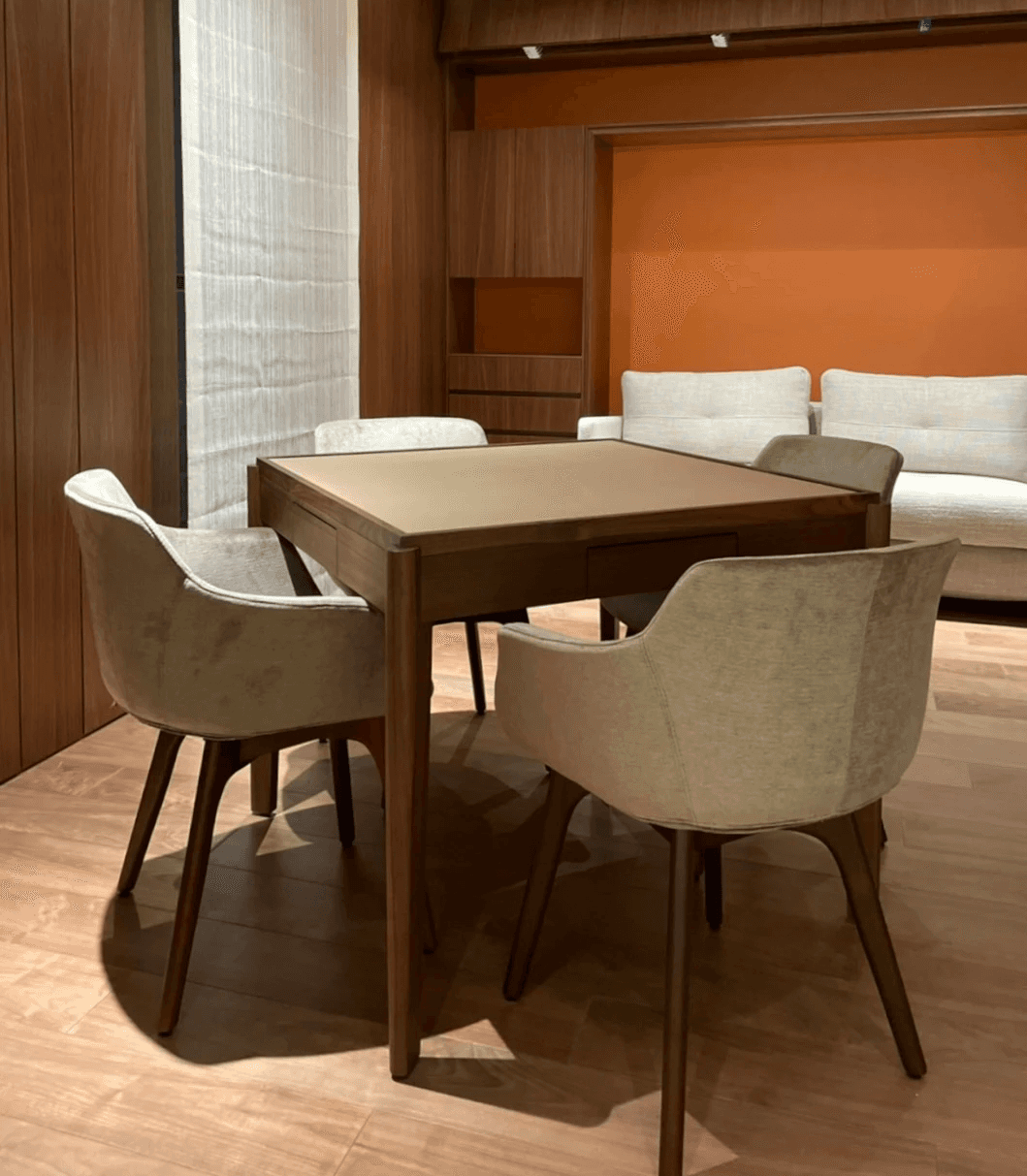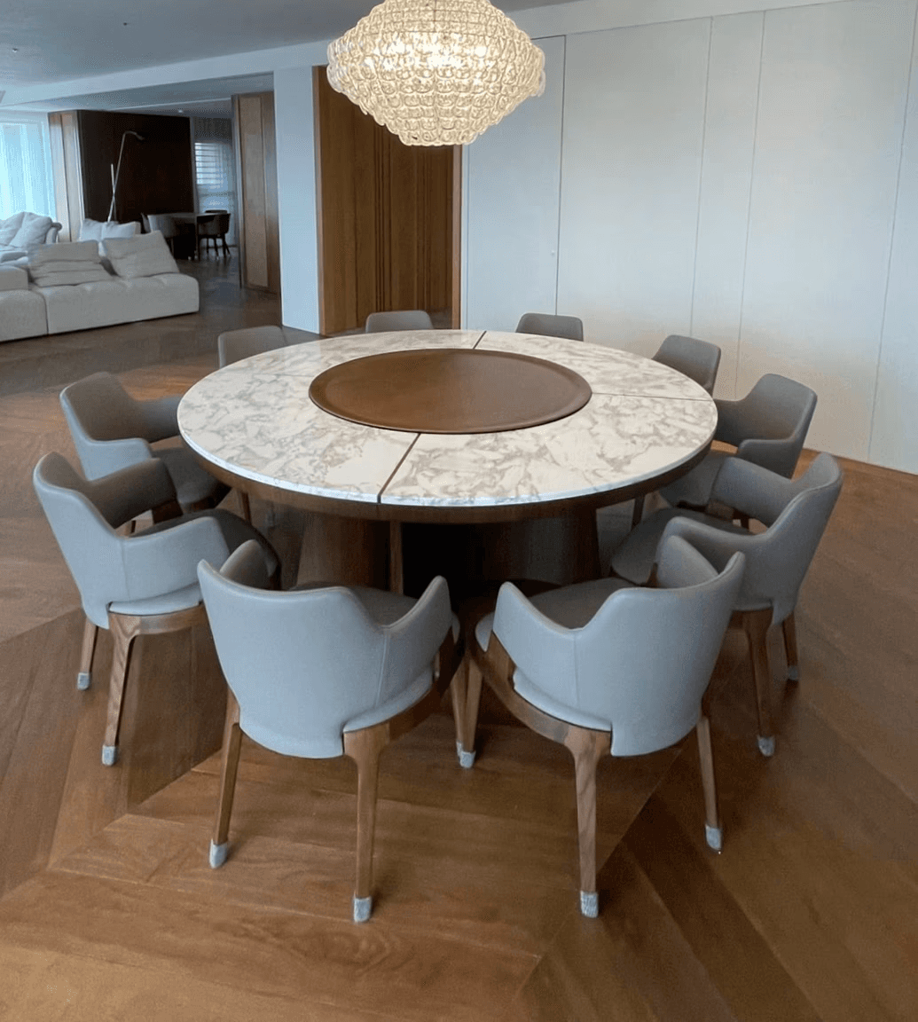 在製作過程中,我們忠實實現每一個設計細節。無論是櫃體上的木頭拼接,餐桌的弧形桌腳,還是麻將桌上精緻的卡楯細節,我們的師傅們都以匠心打造,並以石材和皮革精緻收邊,實現異材質的完美融合,達成視覺與觸感的雙重享受。