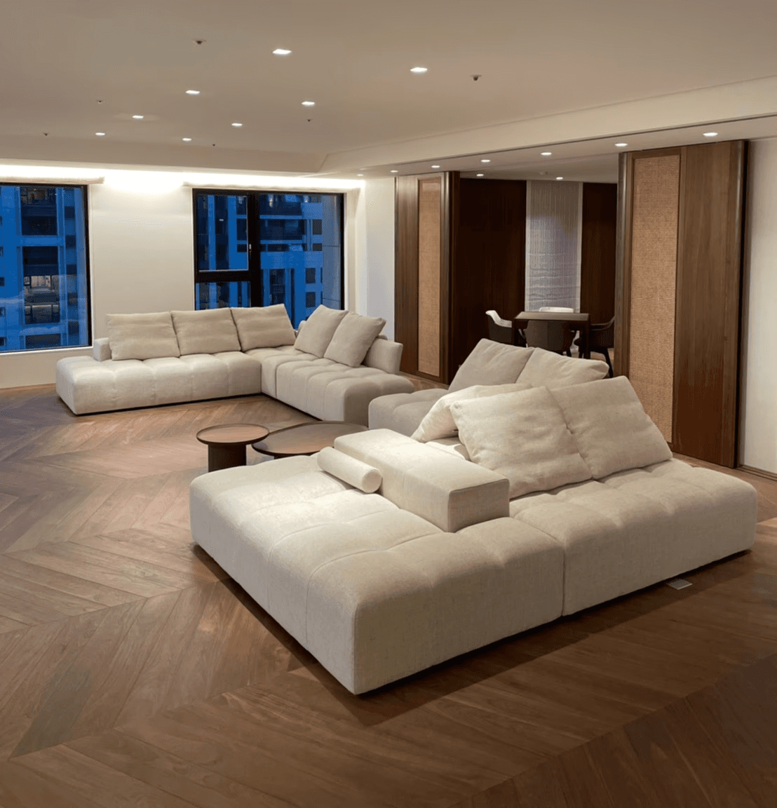 該住家由兩戶打通而成,總面積達170坪。整體設計旨在營造出奢華、舒適且大氣的空間感受。因此我們為每一件家具精心挑選材料,以確保整體空間的和諧統一,運用了胡桃木、皮革、石材及進口布料等高品質素材,最大化展現業主設計的價值。