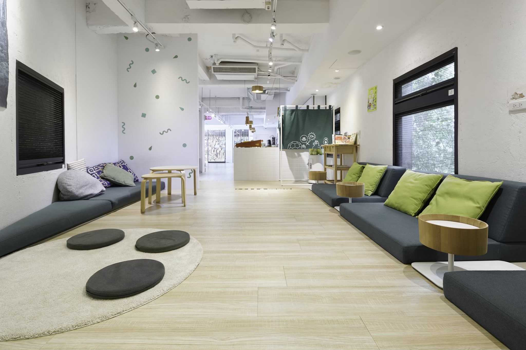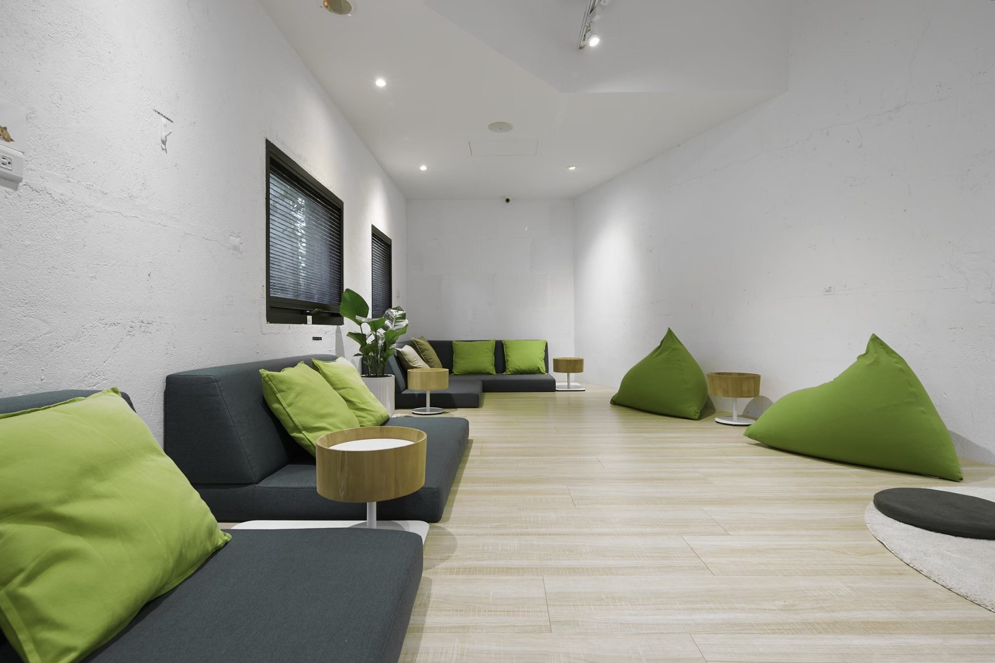 Hangout 大廳客桌、休息區臥榻沙發、木盆茶几