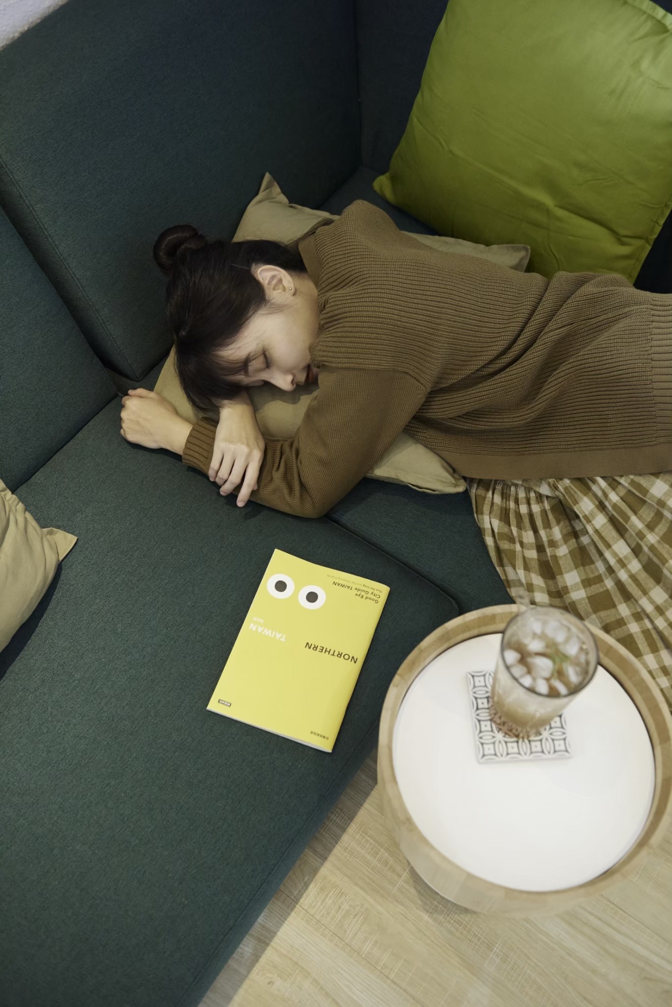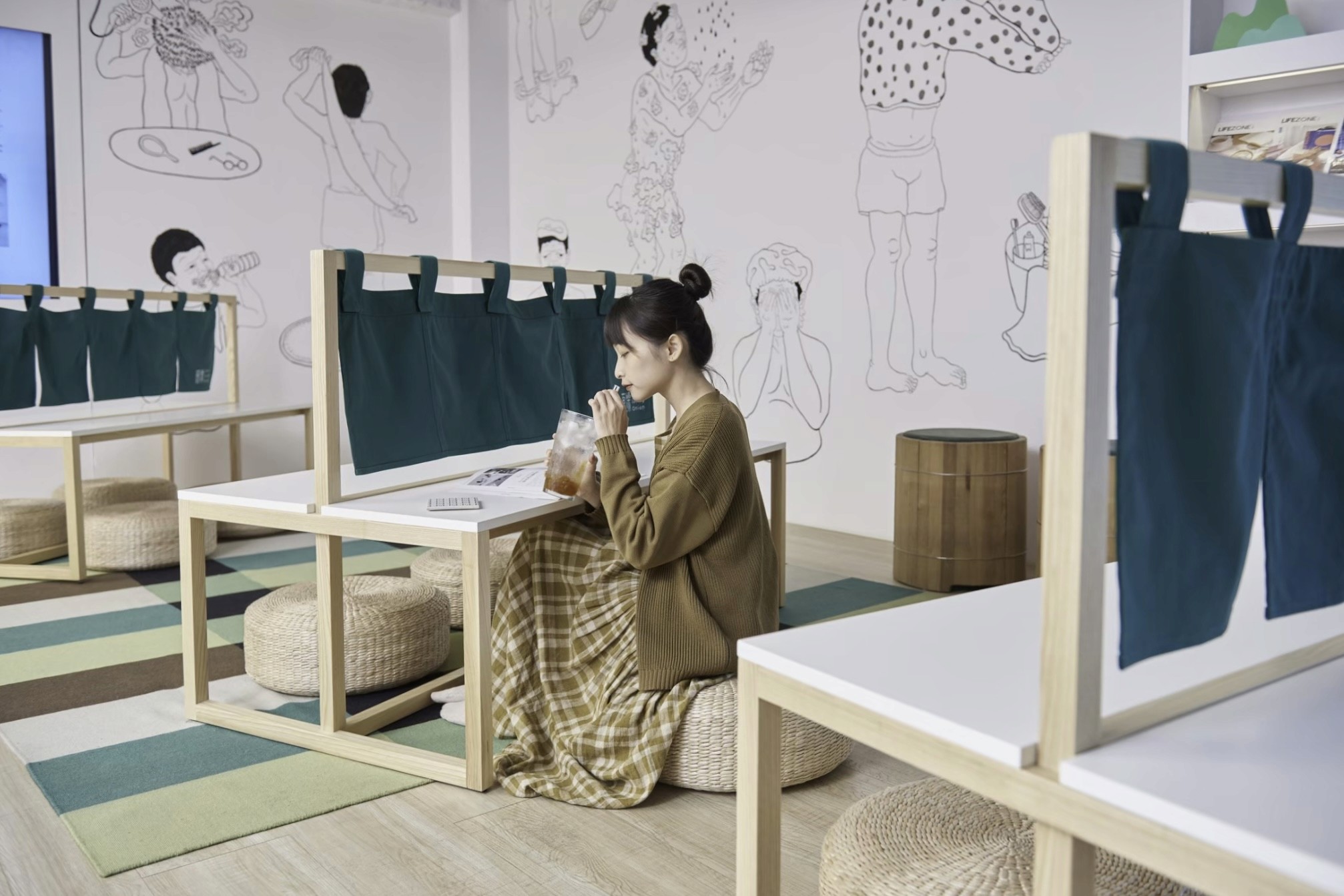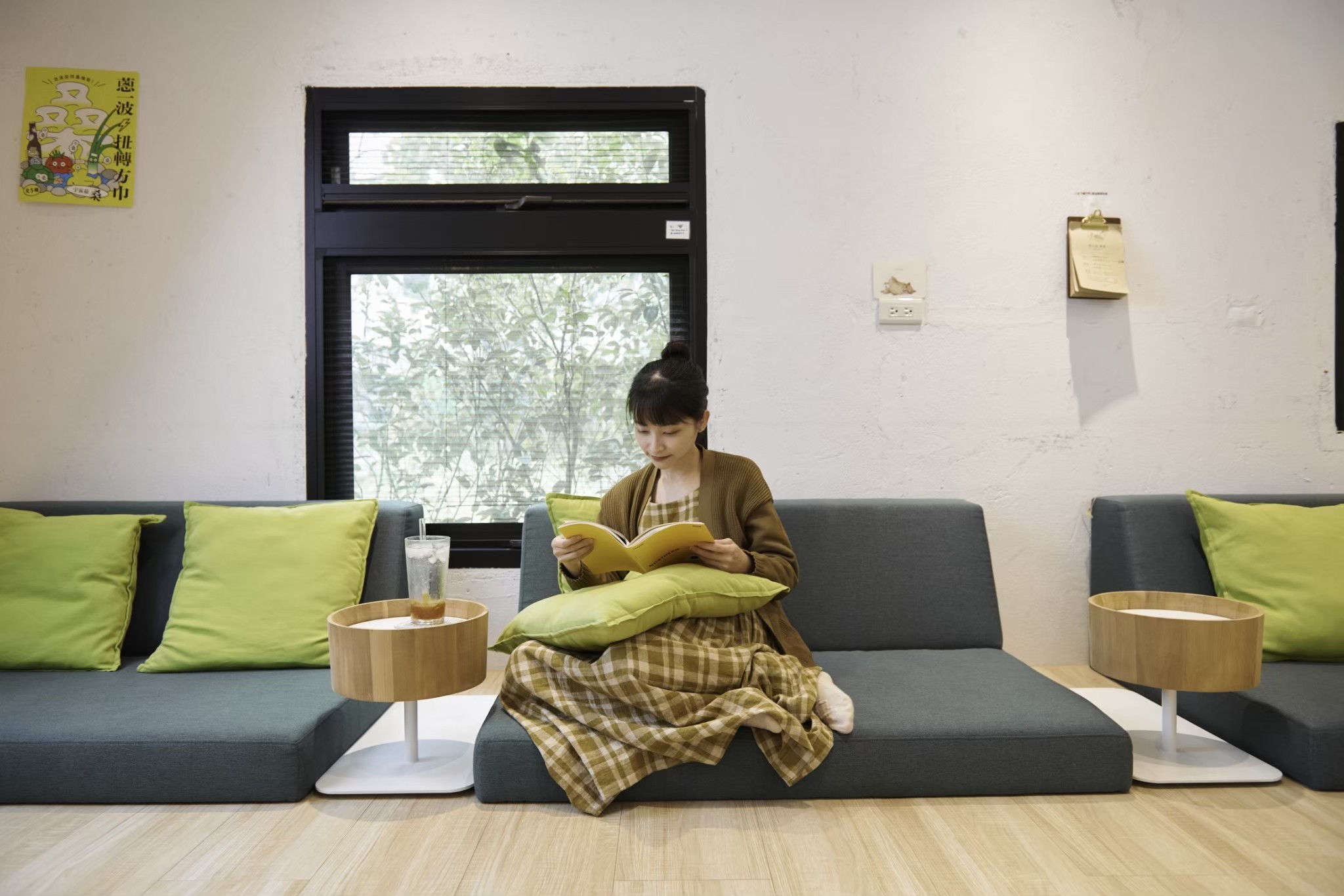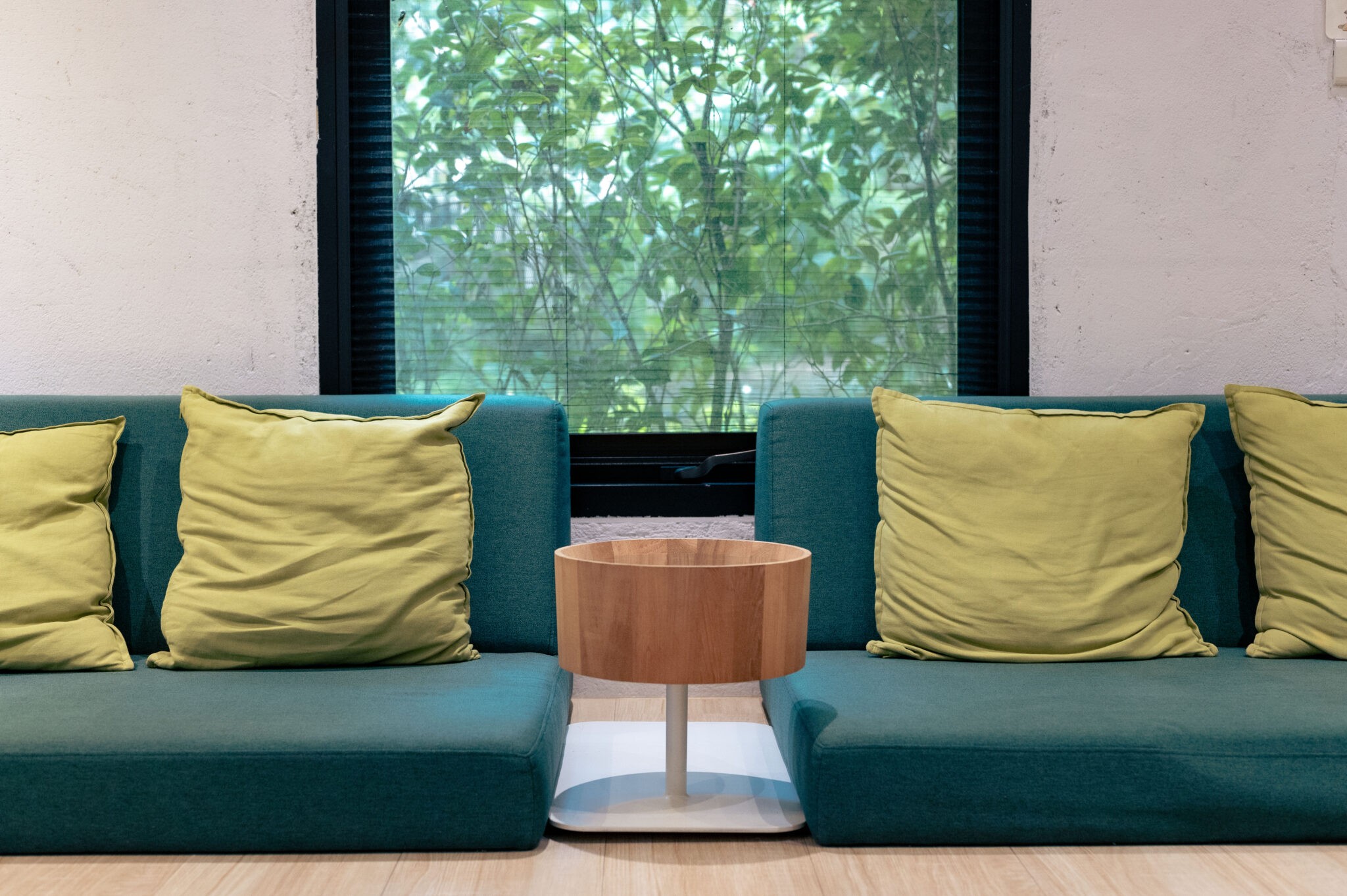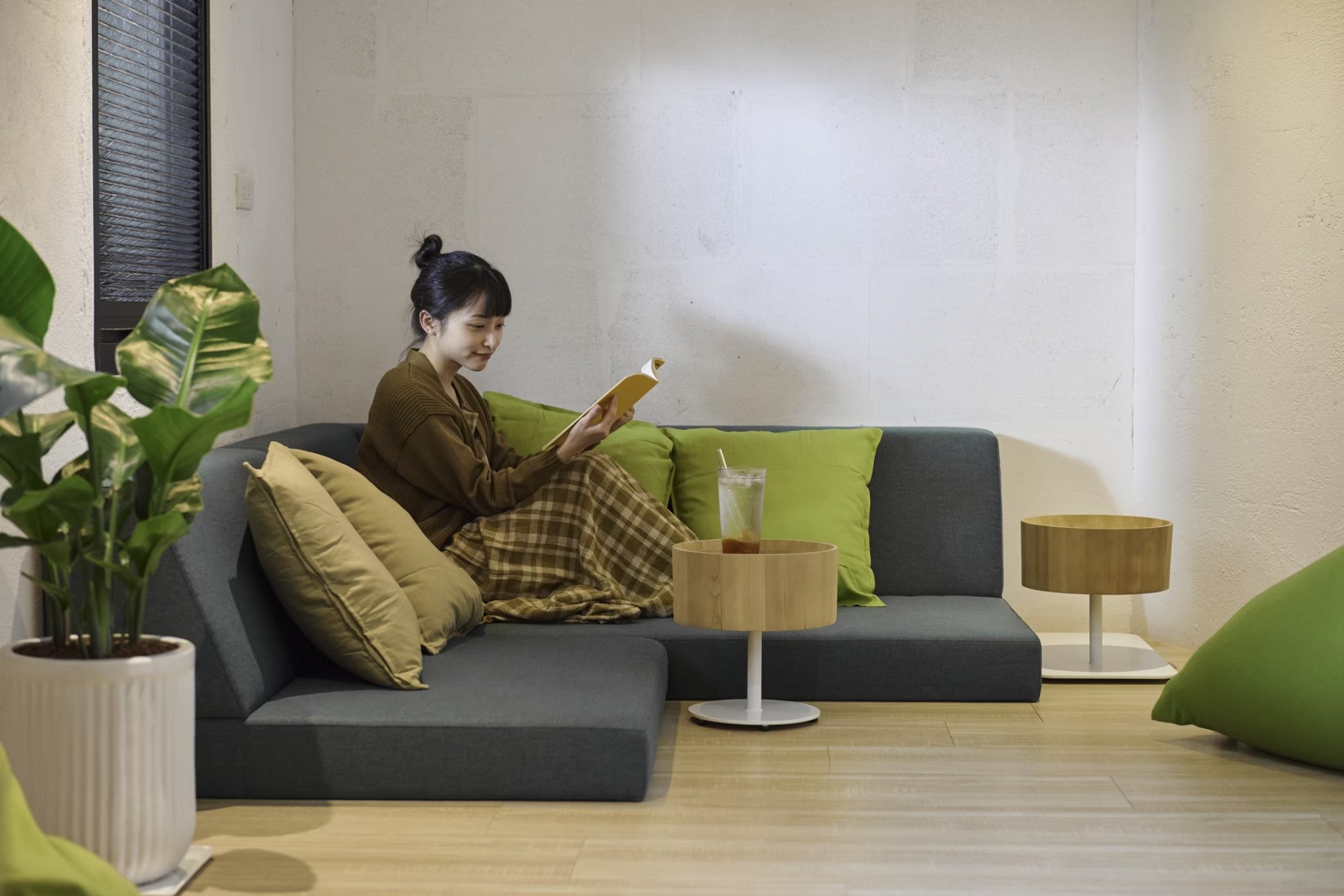 臥榻沙發選用高密度泡棉製作,雖然坐高較低,仍提供穩定的支撐,使整體氛圍更加自然與舒適。沙發旁的木盆茶几則融合現成物件與訂製金屬腳座,貼合品牌故事與空間需求。