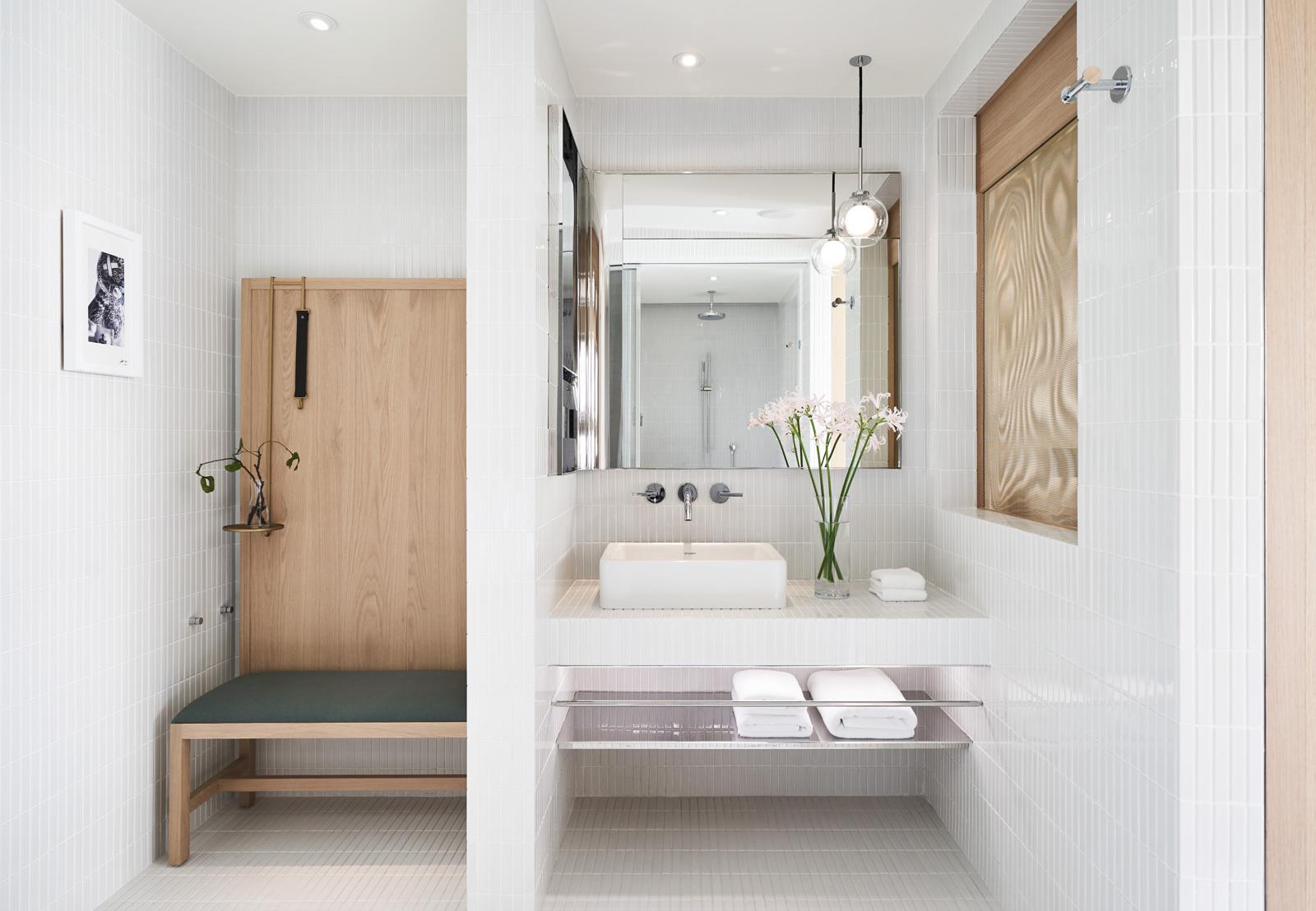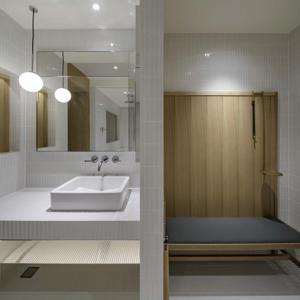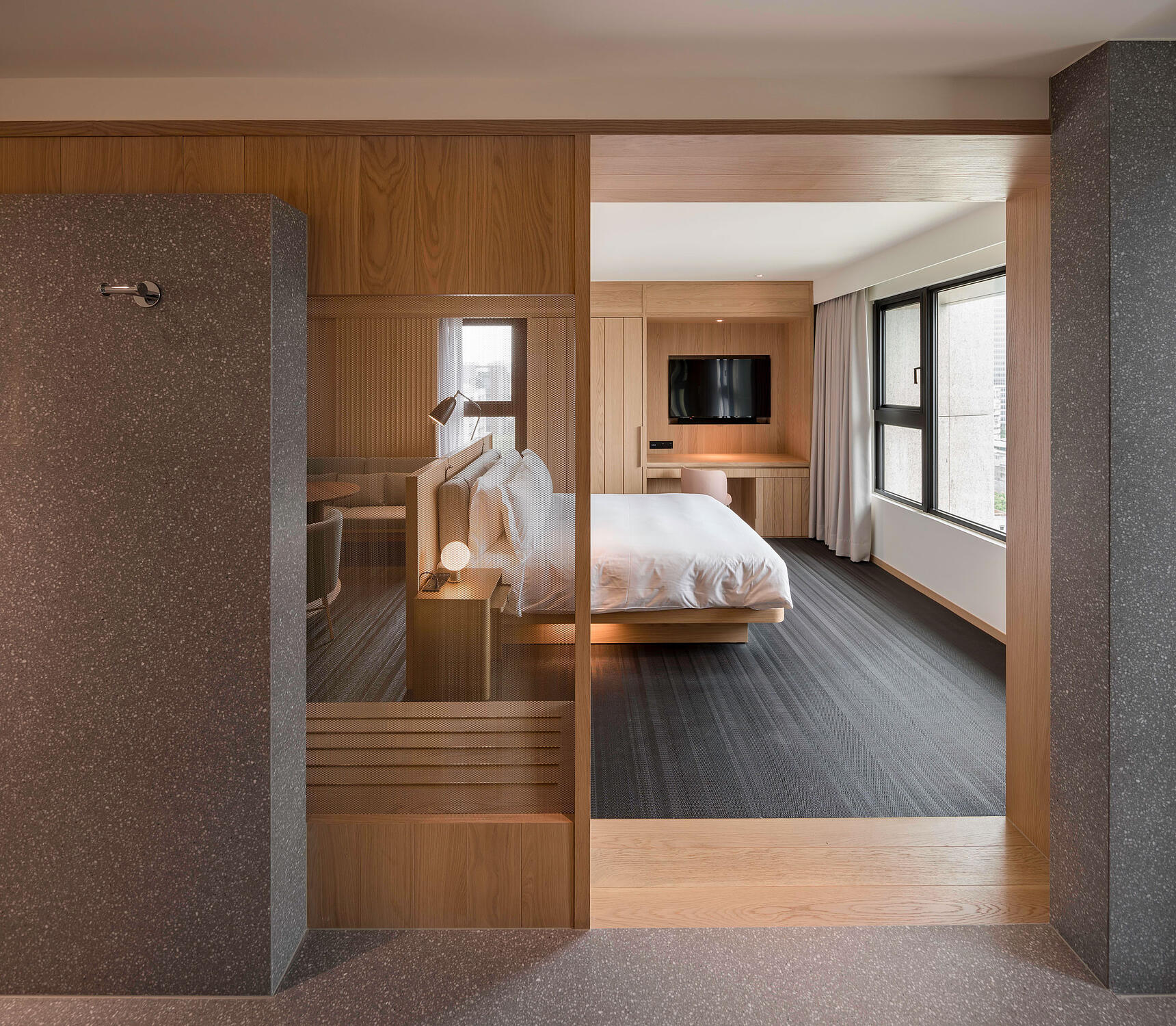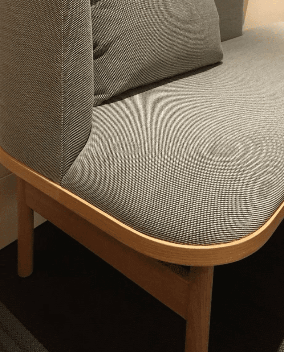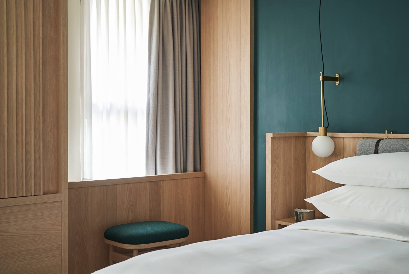 此外,酒店的每一個房型也都根據需求訂製了相應家具,包括落塵區的穿鞋凳、床頭櫃、沙發與床架。我們利用多年的沙發和木工經驗,運用Kvadrat羊毛布,打造出柔軟舒適且厚實包覆的家具,傳遞出如庇護所般的溫暖與穩定感。