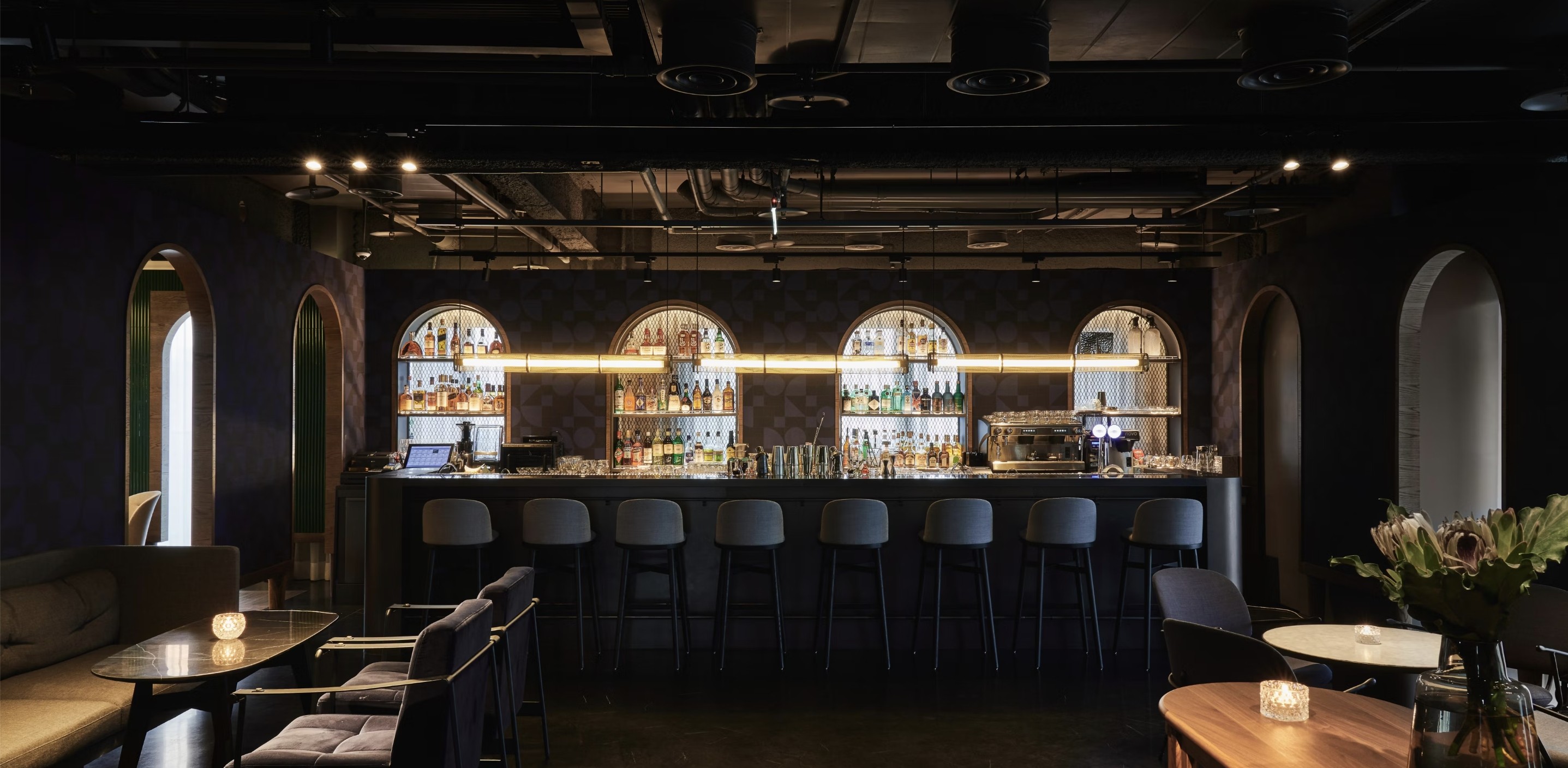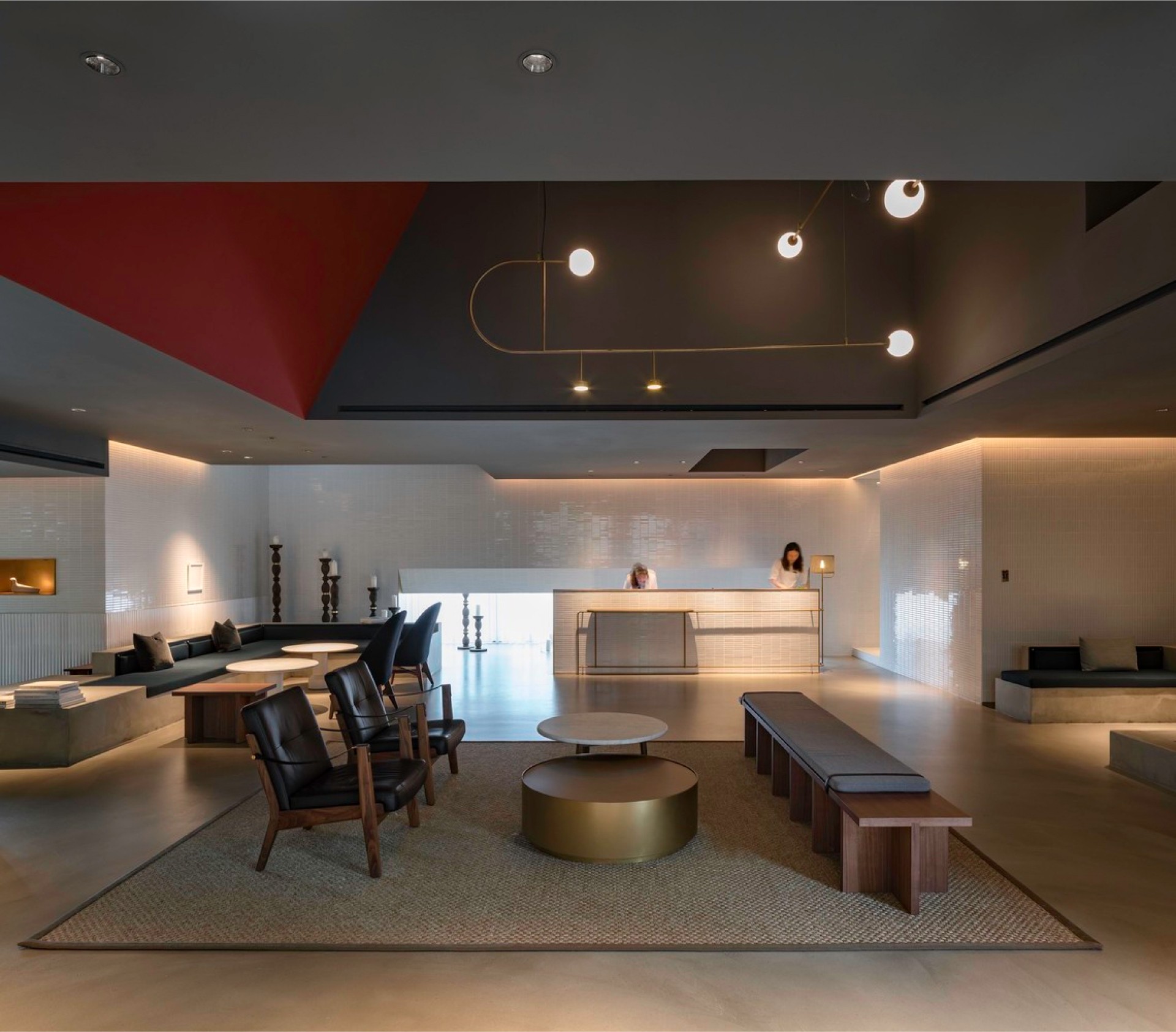 從大廳進入,挑高空間與精緻細節營造出奢華與舒適兼具的氛圍。每件家具都運用特定的材料,以實現統一同時豐富的品牌體驗。我們運用了胡桃木、皮革、羊毛布與銅色金屬等,確保不同材質的加工與整合,最大化業主設計的價值。